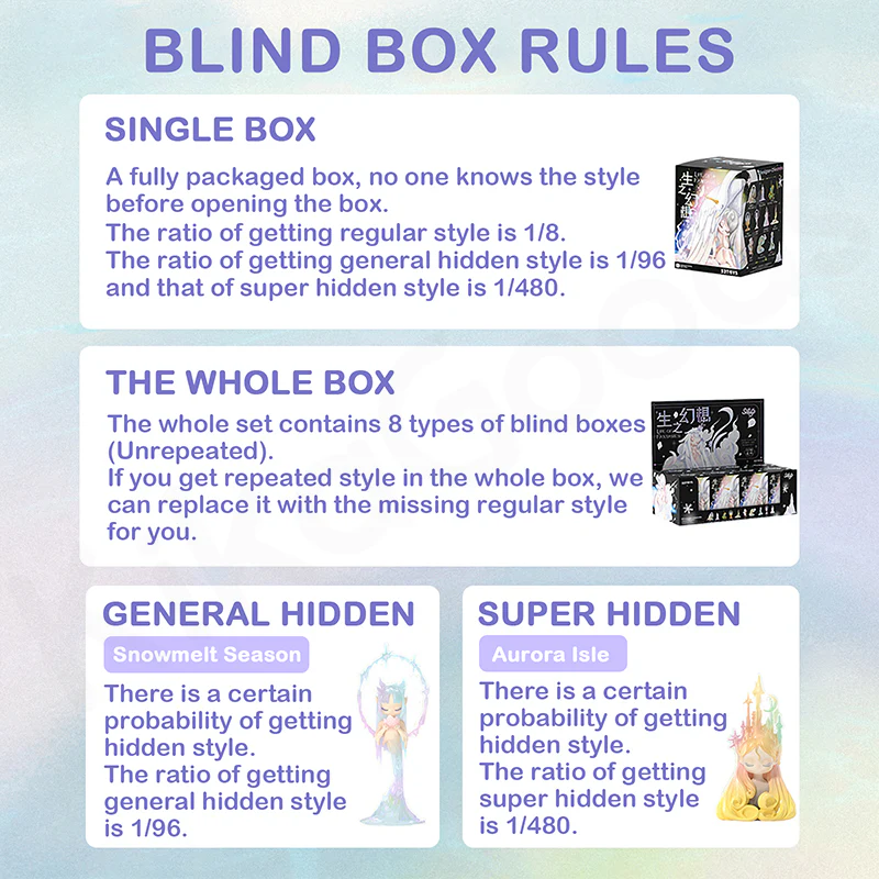 3. The production ratio of general hidden mini-figure (Snowmelt Season) is 1/96, and the production ratio of super hidden mini-figure (Aurora Isle) is 1/480.
